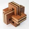 As we did on Crooked 6 Board Burr #2, twelve magnets were added to stabilize the puzzle. The polarity of those magnets also provides clues as to which pieces should be paired with which pieces. When we produced version #01, Juno made a simple miscalculation and made the puzzle significantly larger than originally planned. Version #02 is smaller and lighter, so even with additional work to add magnets, we could reduce the production cost of this puzzle.