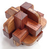 Bubinga heartwood is used for the 2×2 profile pieces and the 3×1 profile pieces have an outer layer of Satin Sycamore and an inner layer of Bubinga sapwood. The length of the pieces reaches 115 mm and the cubic volume and weight of the puzzle are two to three times larger than our ordinary six-piece burr puzzles. The puzzle will stand out on the shelf when displayed.