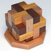 It is made from three different species of wood. Ignoring the colors, there are 236 possible solutions; however, if you arrange the pieces so that the surface color pattern is aesthetically pleasing, there is only one solution.